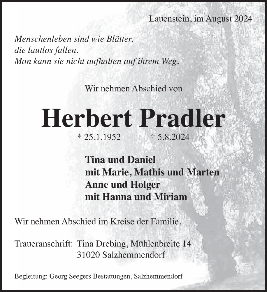 Hier finden Sie alle Traueranzeigen aus der Zeitung, die bisher für Herbert Pradler erschienen sind. Weitere Traueranzeigen, die in der Zeitung erscheinen, werden hier ebenfalls aufgelistet