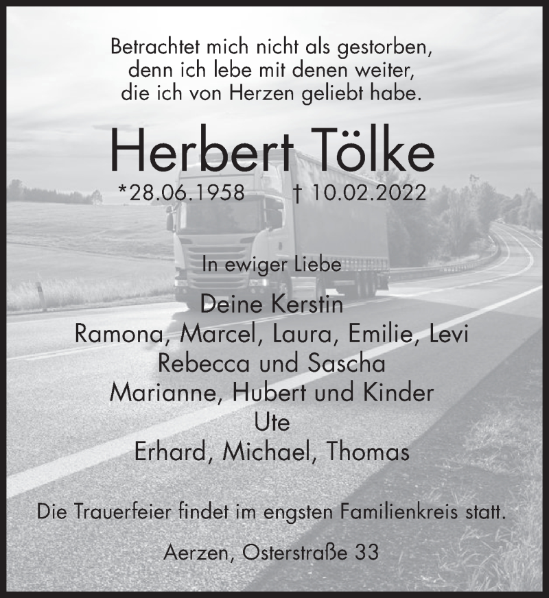 Hier finden Sie alle Traueranzeigen aus der Zeitung, die bisher für Herbert Tölke erschienen sind. Weitere Traueranzeigen, die in der Zeitung erscheinen, werden hier ebenfalls aufgelistet