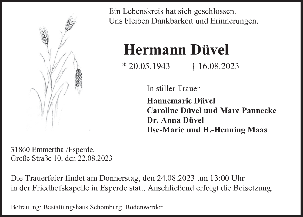 Hier finden Sie alle Traueranzeigen aus der Zeitung, die bisher für Hermann Düvel erschienen sind. Weitere Traueranzeigen, die in der Zeitung erscheinen, werden hier ebenfalls aufgelistet