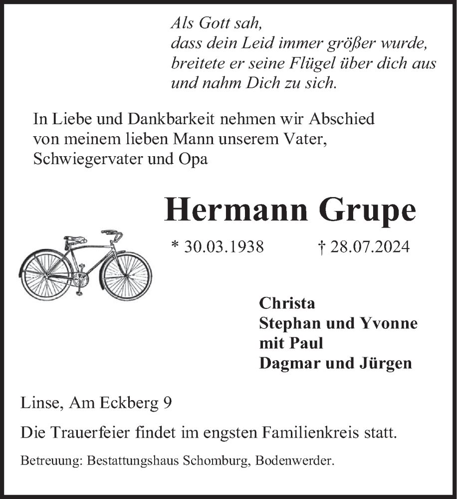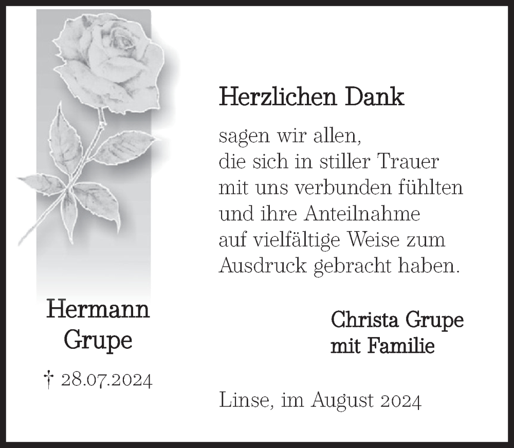 Hier finden Sie alle Traueranzeigen aus der Zeitung, die bisher für Hermann Grupe erschienen sind. Weitere Traueranzeigen, die in der Zeitung erscheinen, werden hier ebenfalls aufgelistet