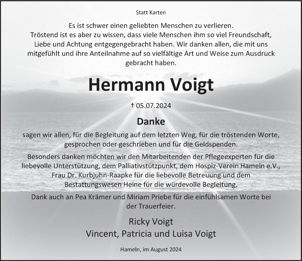 Hier finden Sie alle Traueranzeigen aus der Zeitung, die bisher für Hermann Voigt erschienen sind. Weitere Traueranzeigen, die in der Zeitung erscheinen, werden hier ebenfalls aufgelistet