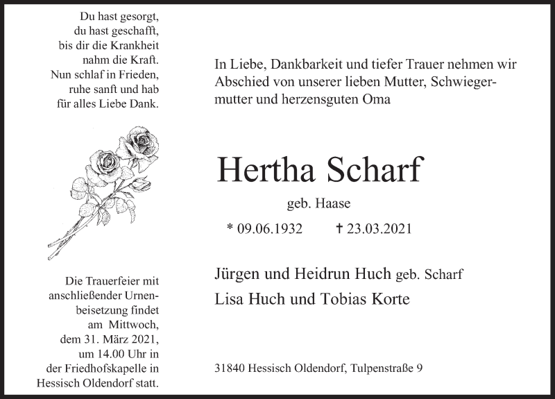 Hier finden Sie alle Traueranzeigen aus der Zeitung, die bisher für Hertha Scharf erschienen sind. Weitere Traueranzeigen, die in der Zeitung erscheinen, werden hier ebenfalls aufgelistet