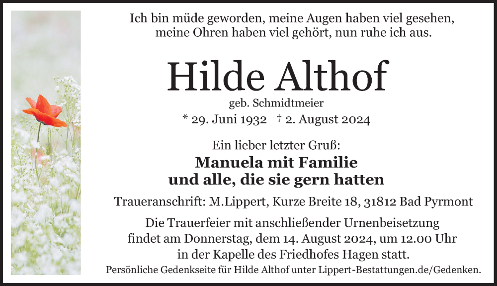 Hier finden Sie alle Traueranzeigen aus der Zeitung, die bisher für Hilde Althof erschienen sind. Weitere Traueranzeigen, die in der Zeitung erscheinen, werden hier ebenfalls aufgelistet