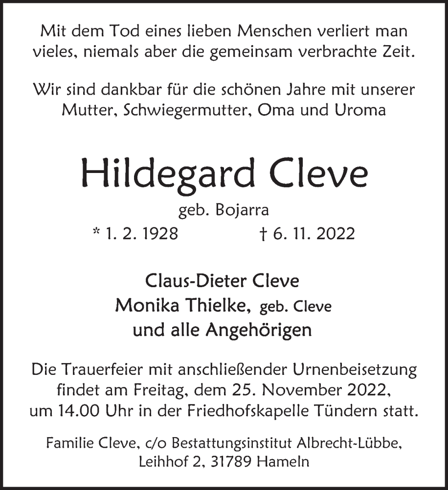 Hier finden Sie alle Traueranzeigen aus der Zeitung, die bisher für Hildegard Cleve erschienen sind. Weitere Traueranzeigen, die in der Zeitung erscheinen, werden hier ebenfalls aufgelistet