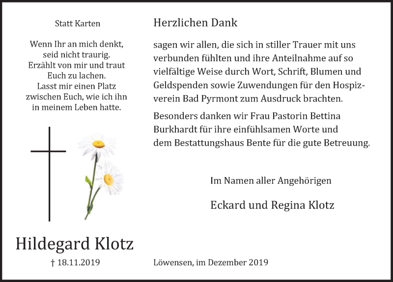 Hier finden Sie alle Traueranzeigen aus der Zeitung, die bisher für Hildegard Klotz erschienen sind. Weitere Traueranzeigen, die in der Zeitung erscheinen, werden hier ebenfalls aufgelistet