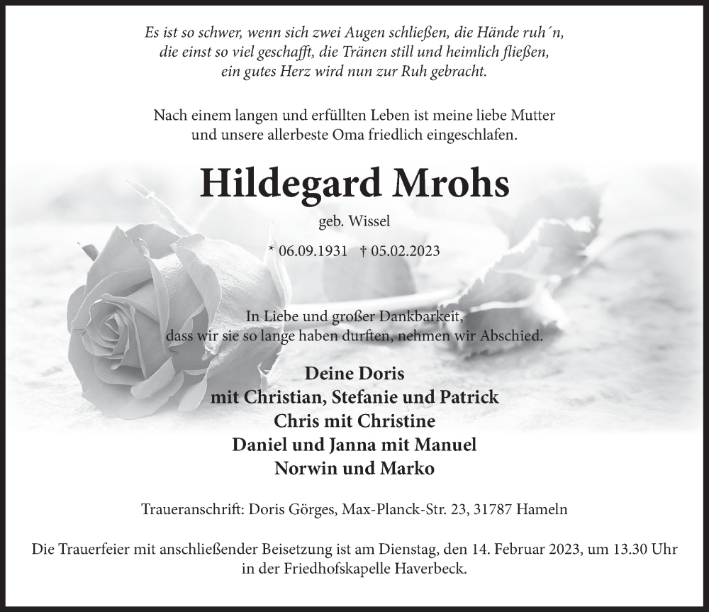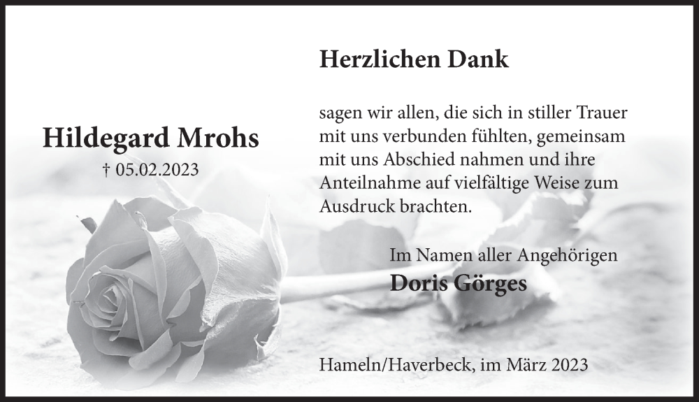 Hier finden Sie alle Traueranzeigen aus der Zeitung, die bisher für Hildegard Mrohs erschienen sind. Weitere Traueranzeigen, die in der Zeitung erscheinen, werden hier ebenfalls aufgelistet