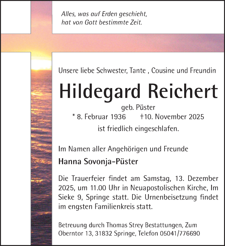 Hier finden Sie alle Traueranzeigen aus der Zeitung, die bisher für Hildegard Reichert erschienen sind. Weitere Traueranzeigen, die in der Zeitung erscheinen, werden hier ebenfalls aufgelistet