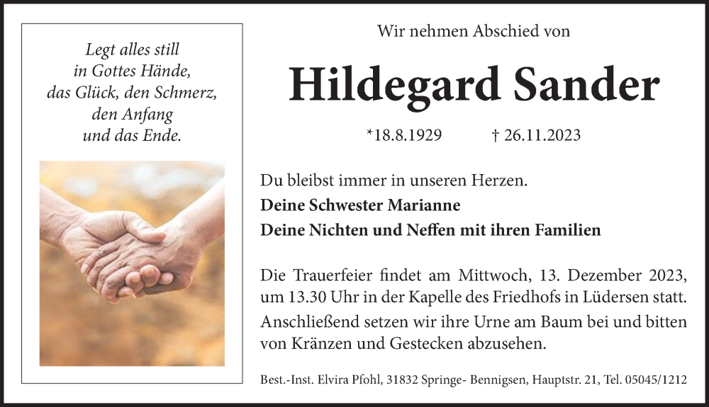 Hier finden Sie alle Traueranzeigen aus der Zeitung, die bisher für Hildegard Sander erschienen sind. Weitere Traueranzeigen, die in der Zeitung erscheinen, werden hier ebenfalls aufgelistet