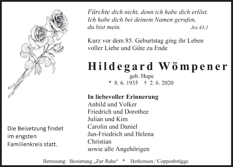 Hier finden Sie alle Traueranzeigen aus der Zeitung, die bisher für Hildegard Wömpener erschienen sind. Weitere Traueranzeigen, die in der Zeitung erscheinen, werden hier ebenfalls aufgelistet