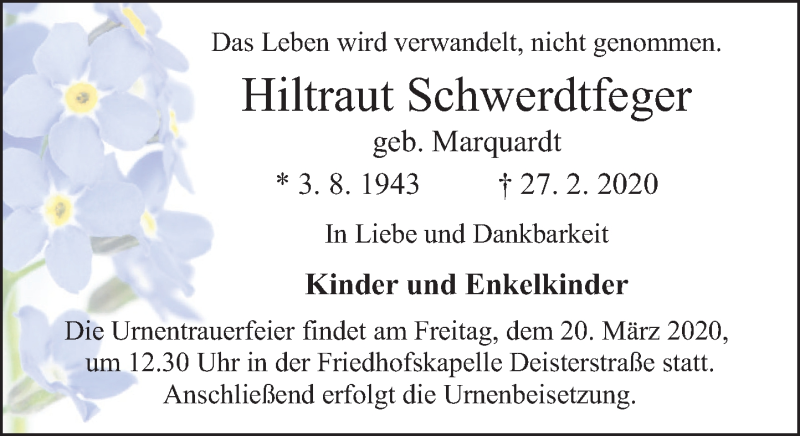 Hier finden Sie alle Traueranzeigen aus der Zeitung, die bisher für Hiltraut Schwerdtfeger erschienen sind. Weitere Traueranzeigen, die in der Zeitung erscheinen, werden hier ebenfalls aufgelistet