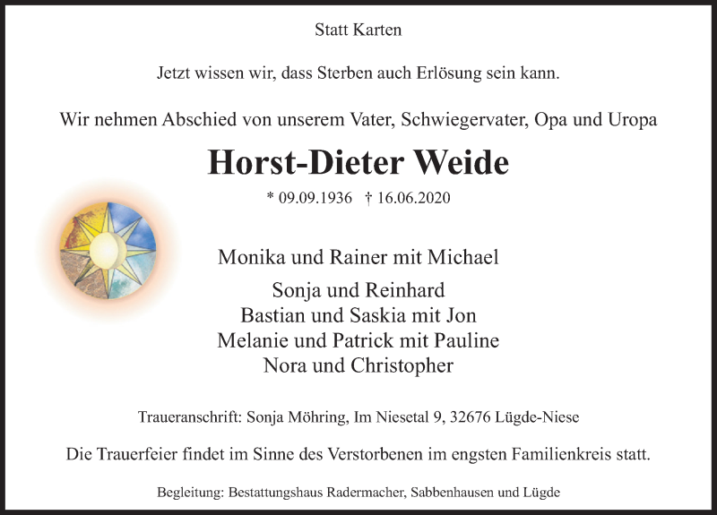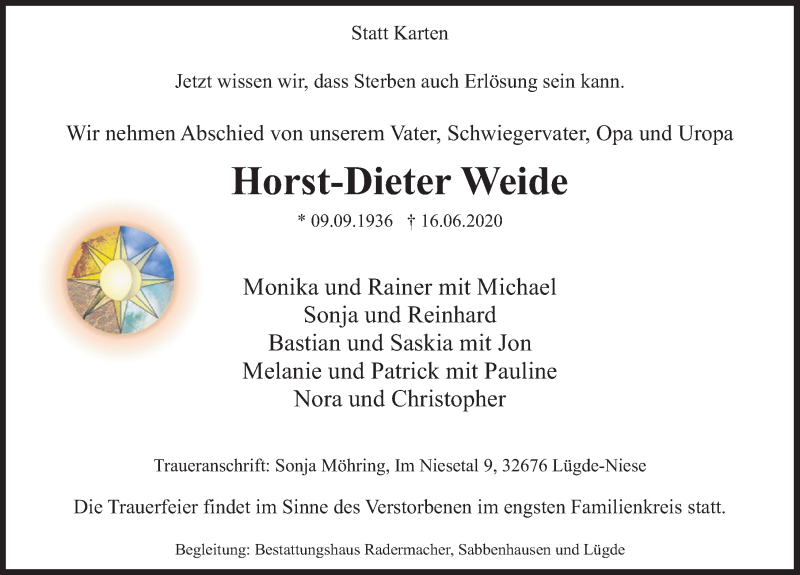 Hier finden Sie alle Traueranzeigen aus der Zeitung, die bisher für Horst-Dieter Weide erschienen sind. Weitere Traueranzeigen, die in der Zeitung erscheinen, werden hier ebenfalls aufgelistet