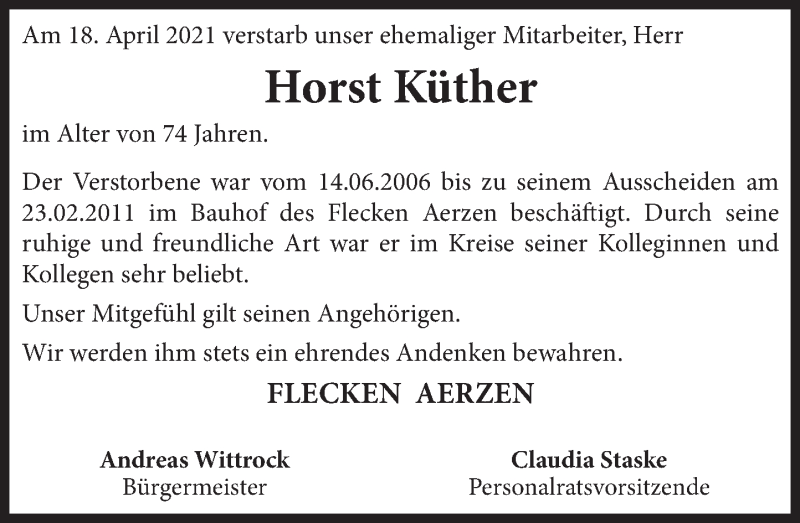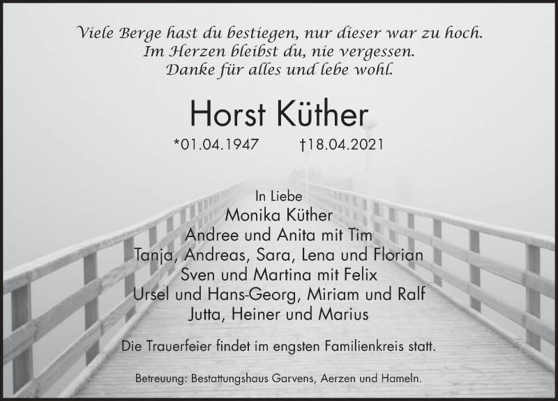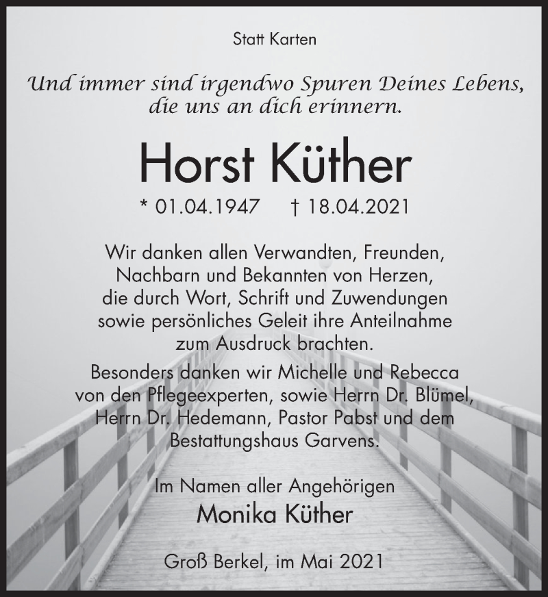 Hier finden Sie alle Traueranzeigen aus der Zeitung, die bisher für Horst Küther erschienen sind. Weitere Traueranzeigen, die in der Zeitung erscheinen, werden hier ebenfalls aufgelistet