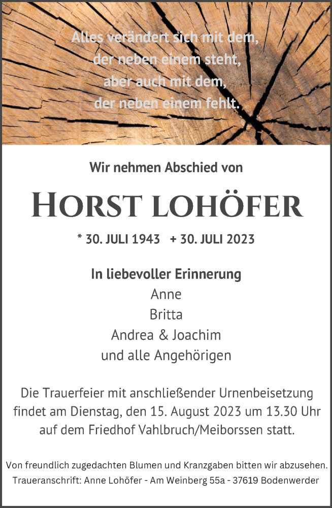 Hier finden Sie alle Traueranzeigen aus der Zeitung, die bisher für Horst Lohöfer erschienen sind. Weitere Traueranzeigen, die in der Zeitung erscheinen, werden hier ebenfalls aufgelistet