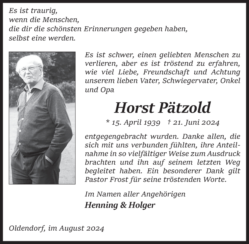 Hier finden Sie alle Traueranzeigen aus der Zeitung, die bisher für Horst Pätzold erschienen sind. Weitere Traueranzeigen, die in der Zeitung erscheinen, werden hier ebenfalls aufgelistet