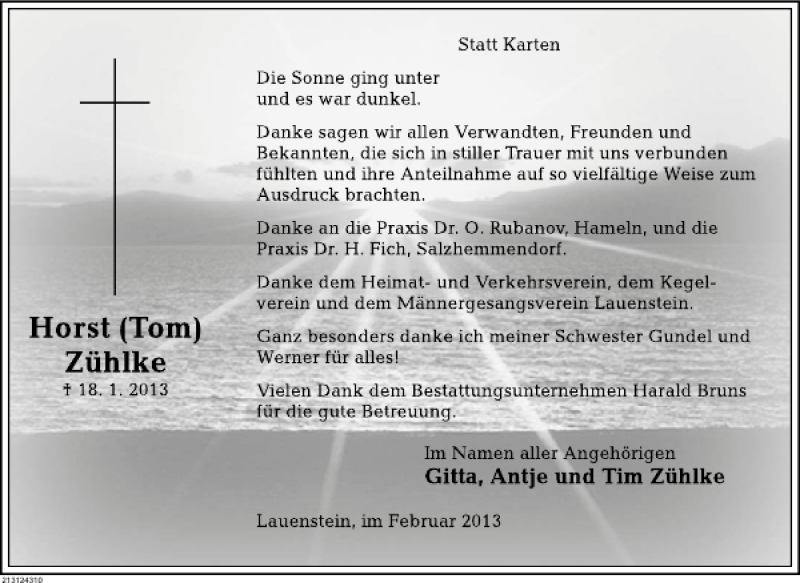 Hier finden Sie alle Traueranzeigen aus der Zeitung, die bisher für Horst (Tom) Zühlke erschienen sind. Weitere Traueranzeigen, die in der Zeitung erscheinen, werden hier ebenfalls aufgelistet