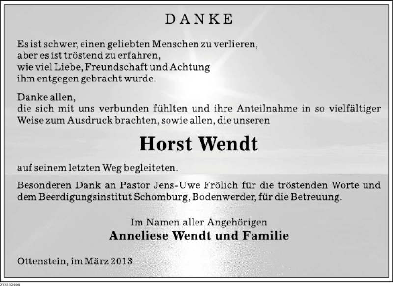 Hier finden Sie alle Traueranzeigen aus der Zeitung, die bisher für Horst Wendt erschienen sind. Weitere Traueranzeigen, die in der Zeitung erscheinen, werden hier ebenfalls aufgelistet