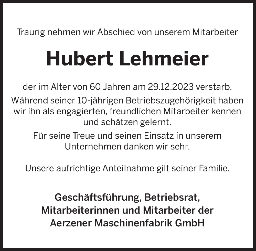 Hier finden Sie alle Traueranzeigen aus der Zeitung, die bisher für Hubert Lehmeier erschienen sind. Weitere Traueranzeigen, die in der Zeitung erscheinen, werden hier ebenfalls aufgelistet