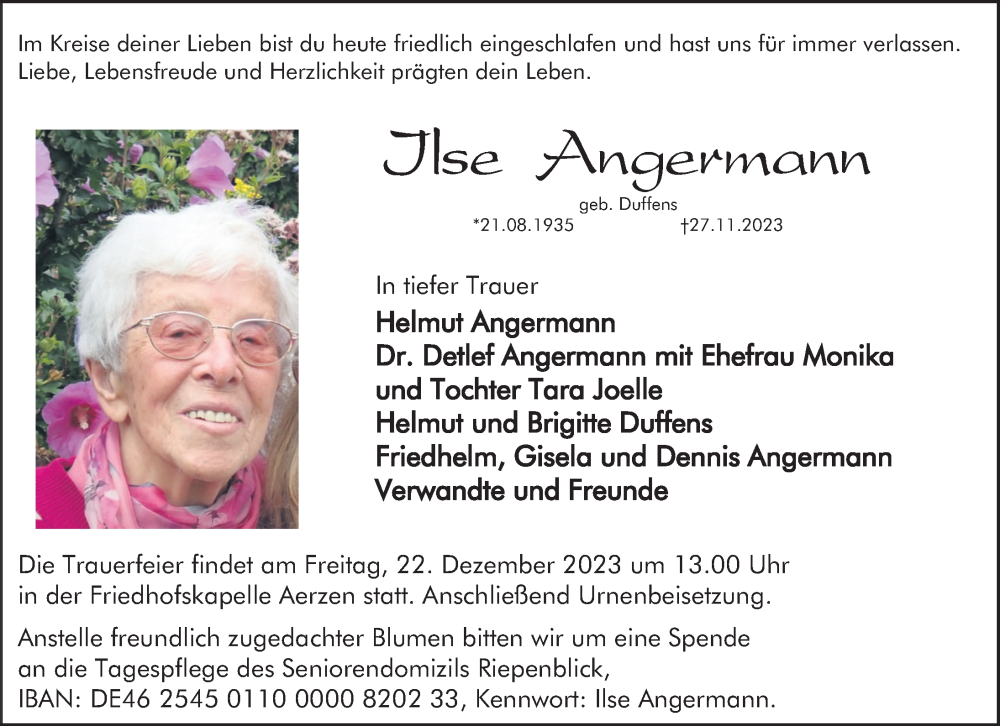 Hier finden Sie alle Traueranzeigen aus der Zeitung, die bisher für Ilse Angermann erschienen sind. Weitere Traueranzeigen, die in der Zeitung erscheinen, werden hier ebenfalls aufgelistet
