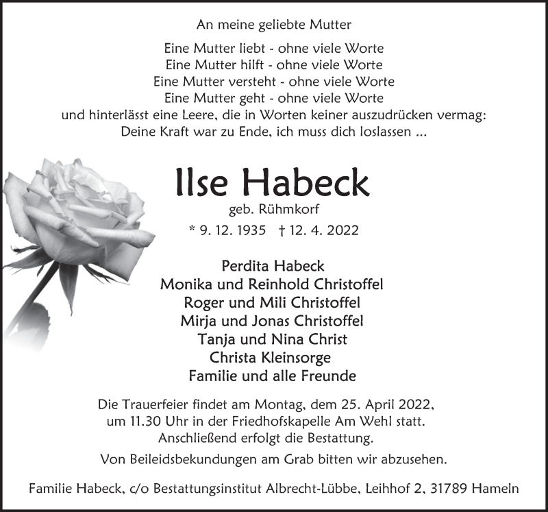 Hier finden Sie alle Traueranzeigen aus der Zeitung, die bisher für Ilse Habeck erschienen sind. Weitere Traueranzeigen, die in der Zeitung erscheinen, werden hier ebenfalls aufgelistet