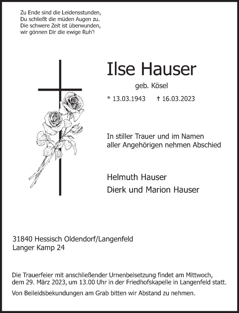 Hier finden Sie alle Traueranzeigen aus der Zeitung, die bisher für Ilse Hauser erschienen sind. Weitere Traueranzeigen, die in der Zeitung erscheinen, werden hier ebenfalls aufgelistet