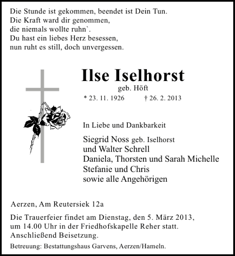 Hier finden Sie alle Traueranzeigen aus der Zeitung, die bisher für Ilse Iselhorst erschienen sind. Weitere Traueranzeigen, die in der Zeitung erscheinen, werden hier ebenfalls aufgelistet