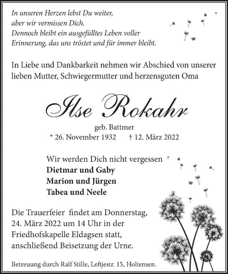 Hier finden Sie alle Traueranzeigen aus der Zeitung, die bisher für Ilse Rokahr erschienen sind. Weitere Traueranzeigen, die in der Zeitung erscheinen, werden hier ebenfalls aufgelistet