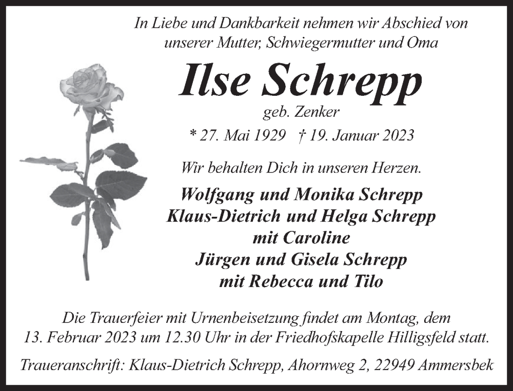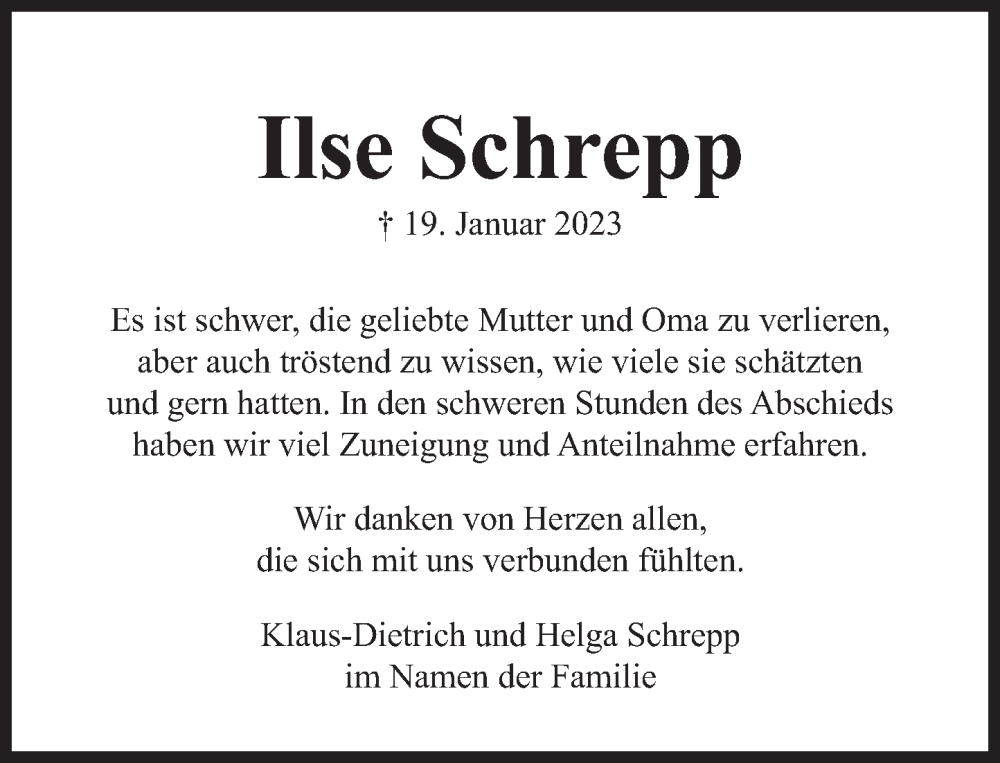Hier finden Sie alle Traueranzeigen aus der Zeitung, die bisher für Ilse Schrepp erschienen sind. Weitere Traueranzeigen, die in der Zeitung erscheinen, werden hier ebenfalls aufgelistet