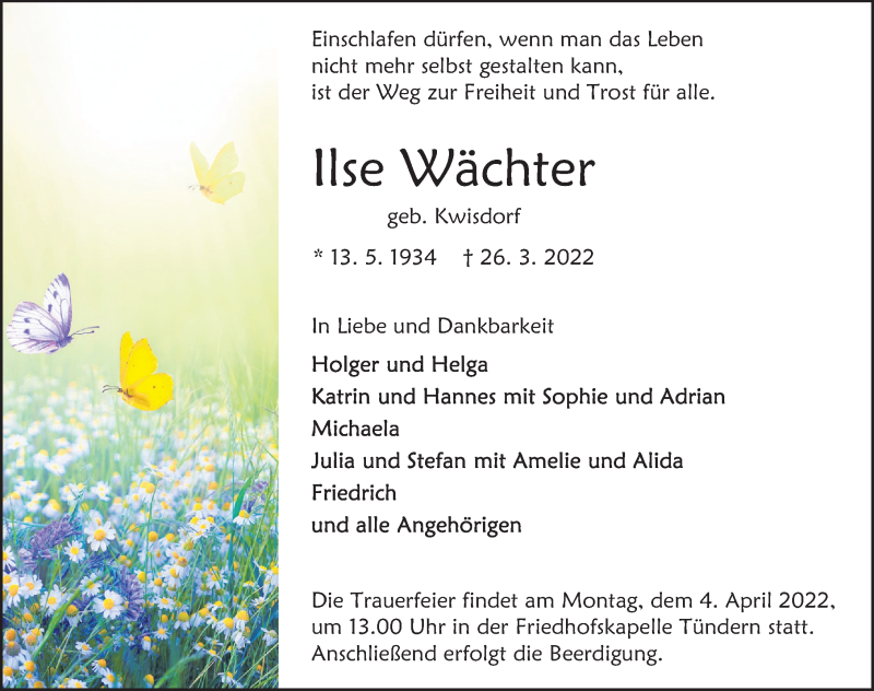 Hier finden Sie alle Traueranzeigen aus der Zeitung, die bisher für Ilse Wächter erschienen sind. Weitere Traueranzeigen, die in der Zeitung erscheinen, werden hier ebenfalls aufgelistet