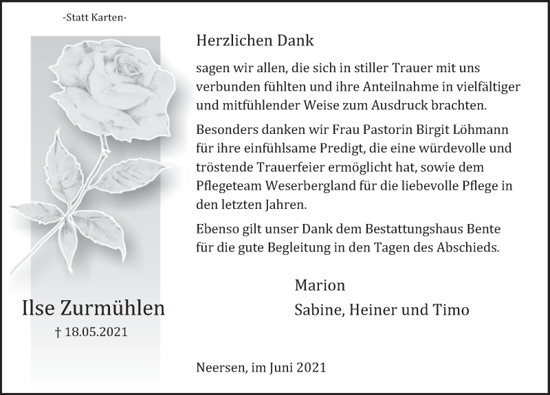 Hier finden Sie alle Traueranzeigen aus der Zeitung, die bisher für Ilse Zurmühlen erschienen sind. Weitere Traueranzeigen, die in der Zeitung erscheinen, werden hier ebenfalls aufgelistet