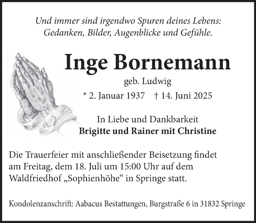 Hier finden Sie alle Traueranzeigen aus der Zeitung, die bisher für Inge Bornemann erschienen sind. Weitere Traueranzeigen, die in der Zeitung erscheinen, werden hier ebenfalls aufgelistet
