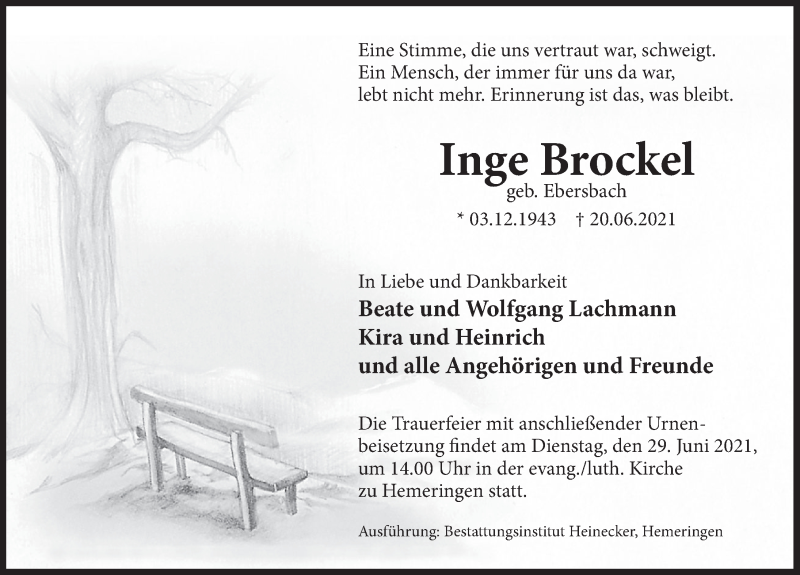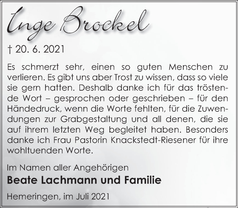 Hier finden Sie alle Traueranzeigen aus der Zeitung, die bisher für Inge Brockel erschienen sind. Weitere Traueranzeigen, die in der Zeitung erscheinen, werden hier ebenfalls aufgelistet
