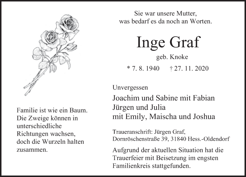 Hier finden Sie alle Traueranzeigen aus der Zeitung, die bisher für Inge Graf erschienen sind. Weitere Traueranzeigen, die in der Zeitung erscheinen, werden hier ebenfalls aufgelistet