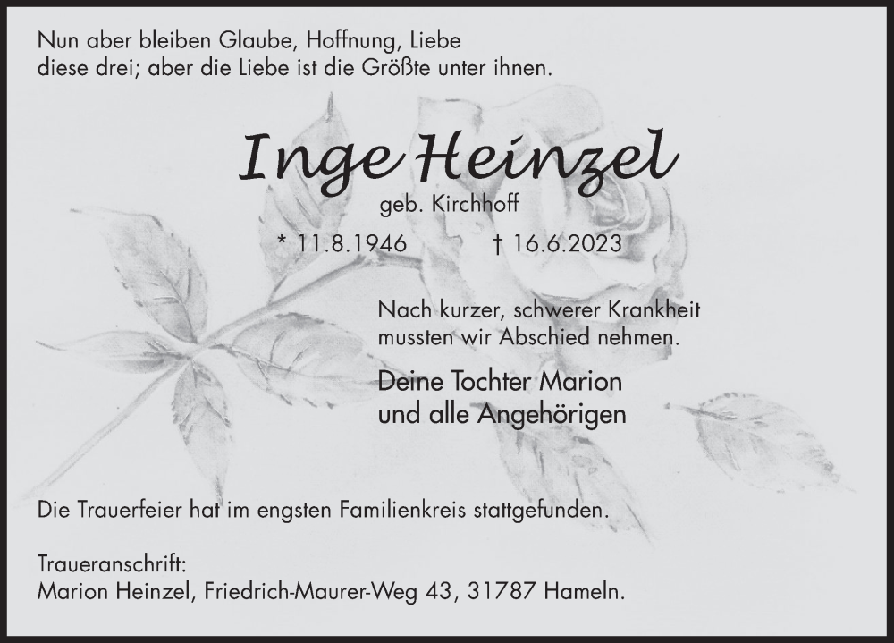 Hier finden Sie alle Traueranzeigen aus der Zeitung, die bisher für Inge Heinzel erschienen sind. Weitere Traueranzeigen, die in der Zeitung erscheinen, werden hier ebenfalls aufgelistet