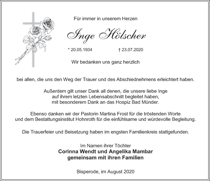 Hier finden Sie alle Traueranzeigen aus der Zeitung, die bisher für Inge Hölscher erschienen sind. Weitere Traueranzeigen, die in der Zeitung erscheinen, werden hier ebenfalls aufgelistet