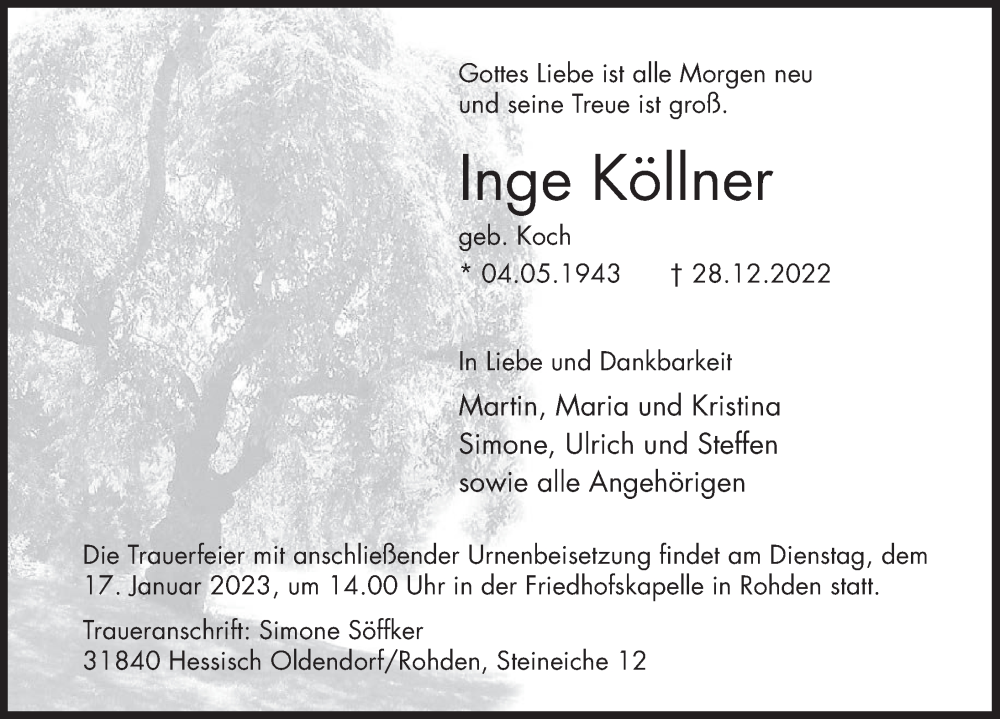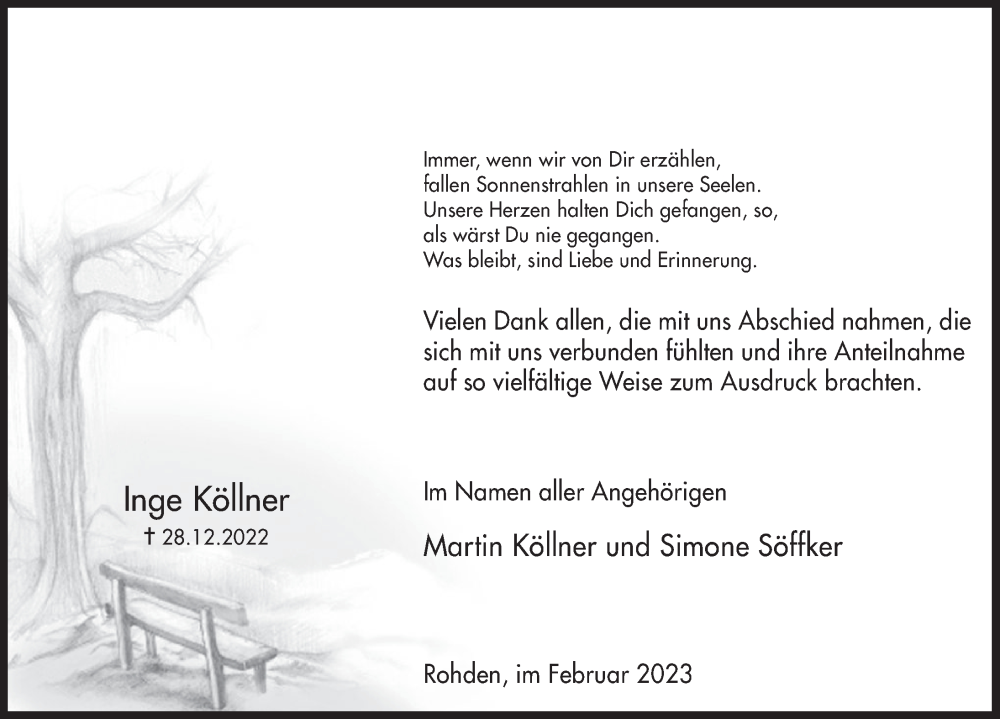 Hier finden Sie alle Traueranzeigen aus der Zeitung, die bisher für Inge Köllner erschienen sind. Weitere Traueranzeigen, die in der Zeitung erscheinen, werden hier ebenfalls aufgelistet