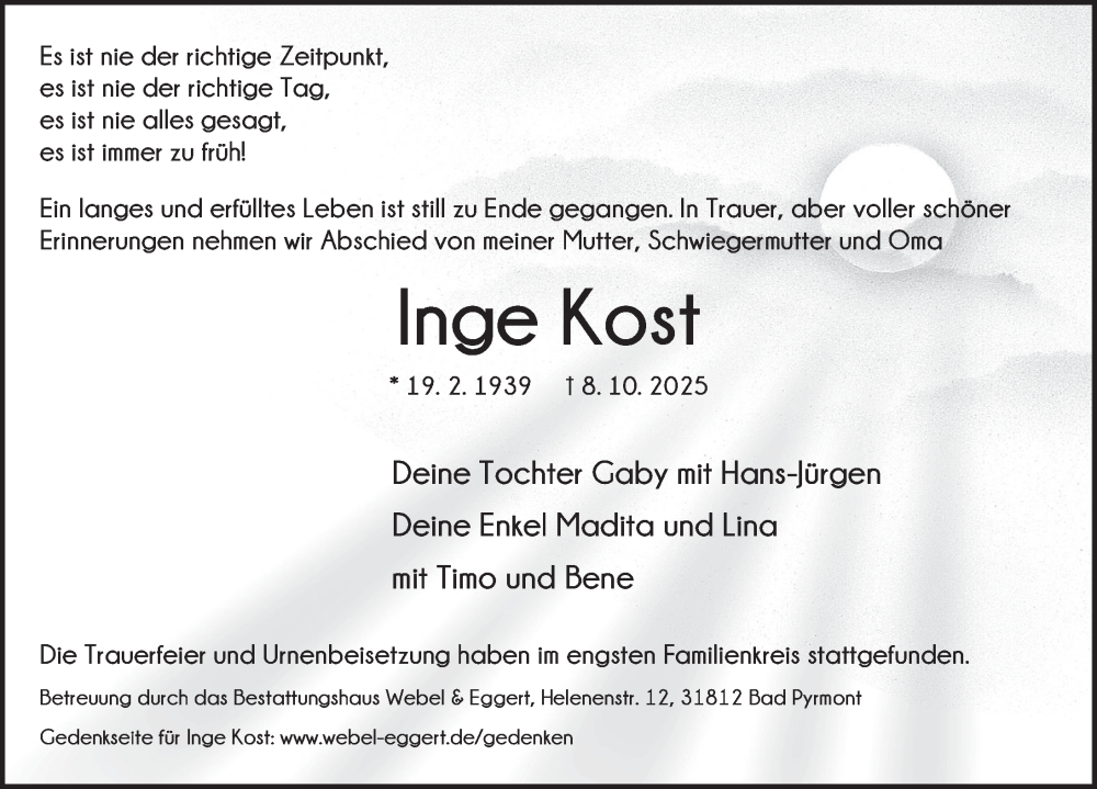 Hier finden Sie alle Traueranzeigen aus der Zeitung, die bisher für Inge Kost erschienen sind. Weitere Traueranzeigen, die in der Zeitung erscheinen, werden hier ebenfalls aufgelistet