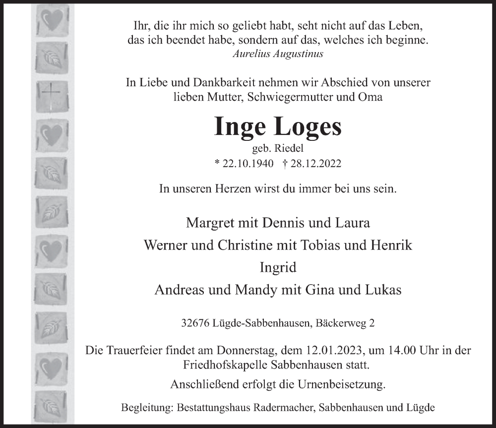 Hier finden Sie alle Traueranzeigen aus der Zeitung, die bisher für Inge Loges erschienen sind. Weitere Traueranzeigen, die in der Zeitung erscheinen, werden hier ebenfalls aufgelistet