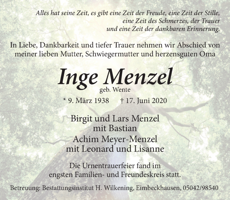 Hier finden Sie alle Traueranzeigen aus der Zeitung, die bisher für Inge Menzel erschienen sind. Weitere Traueranzeigen, die in der Zeitung erscheinen, werden hier ebenfalls aufgelistet