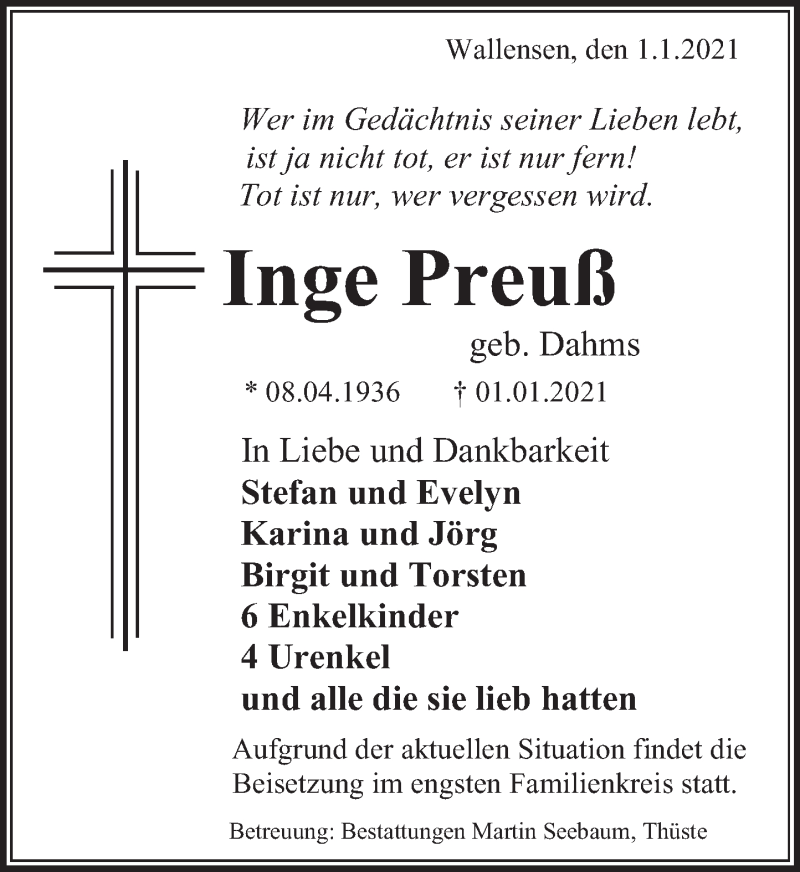 Hier finden Sie alle Traueranzeigen aus der Zeitung, die bisher für Inge Preuß erschienen sind. Weitere Traueranzeigen, die in der Zeitung erscheinen, werden hier ebenfalls aufgelistet