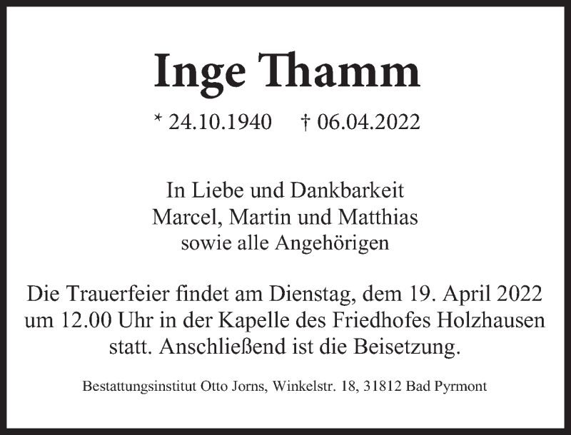 Hier finden Sie alle Traueranzeigen aus der Zeitung, die bisher für Inge Thamm erschienen sind. Weitere Traueranzeigen, die in der Zeitung erscheinen, werden hier ebenfalls aufgelistet