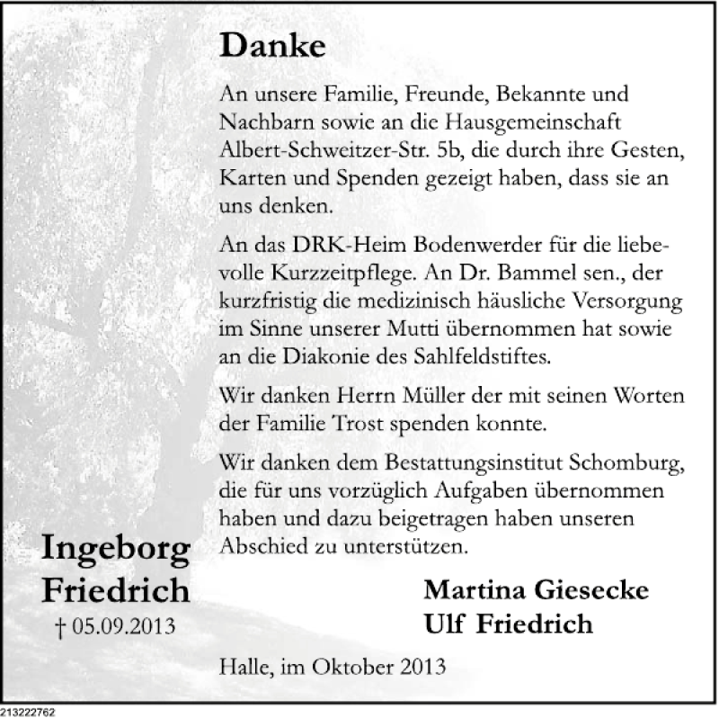 Hier finden Sie alle Traueranzeigen aus der Zeitung, die bisher für Ingeborg Friedrich erschienen sind. Weitere Traueranzeigen, die in der Zeitung erscheinen, werden hier ebenfalls aufgelistet