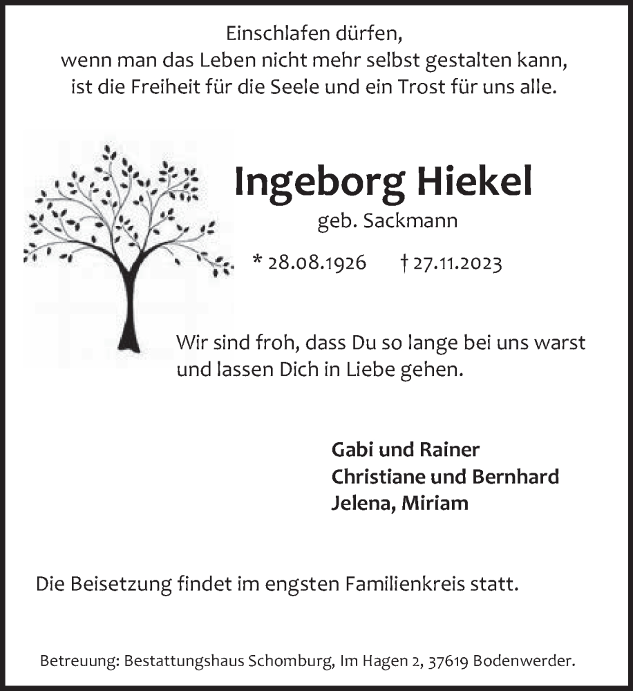 Hier finden Sie alle Traueranzeigen aus der Zeitung, die bisher für Ingeborg Hiekel erschienen sind. Weitere Traueranzeigen, die in der Zeitung erscheinen, werden hier ebenfalls aufgelistet