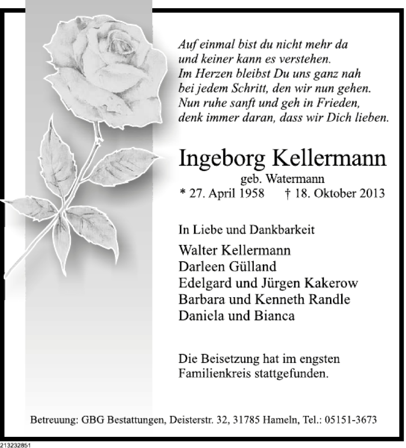 Hier finden Sie alle Traueranzeigen aus der Zeitung, die bisher für Ingeborg Kellermann erschienen sind. Weitere Traueranzeigen, die in der Zeitung erscheinen, werden hier ebenfalls aufgelistet