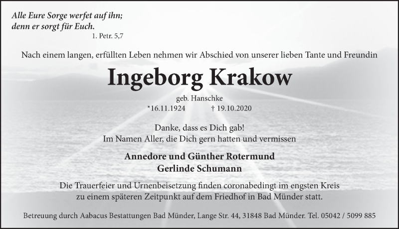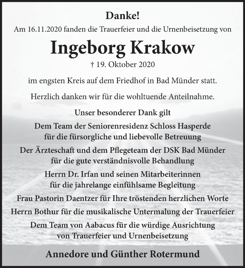 Hier finden Sie alle Traueranzeigen aus der Zeitung, die bisher für Ingeborg Krakow erschienen sind. Weitere Traueranzeigen, die in der Zeitung erscheinen, werden hier ebenfalls aufgelistet