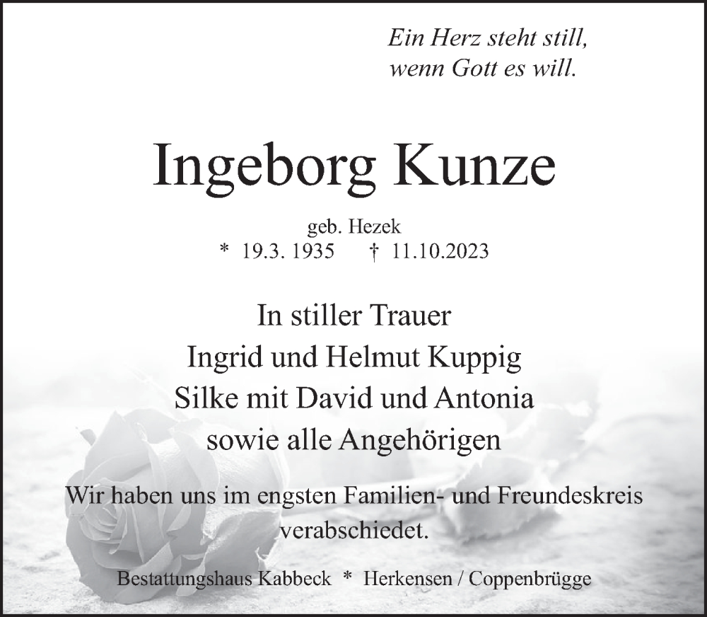 Hier finden Sie alle Traueranzeigen aus der Zeitung, die bisher für Ingeborg Kunze erschienen sind. Weitere Traueranzeigen, die in der Zeitung erscheinen, werden hier ebenfalls aufgelistet
