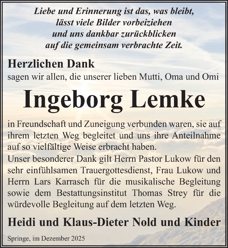 Hier finden Sie alle Traueranzeigen aus der Zeitung, die bisher für Ingeborg Lemke erschienen sind. Weitere Traueranzeigen, die in der Zeitung erscheinen, werden hier ebenfalls aufgelistet