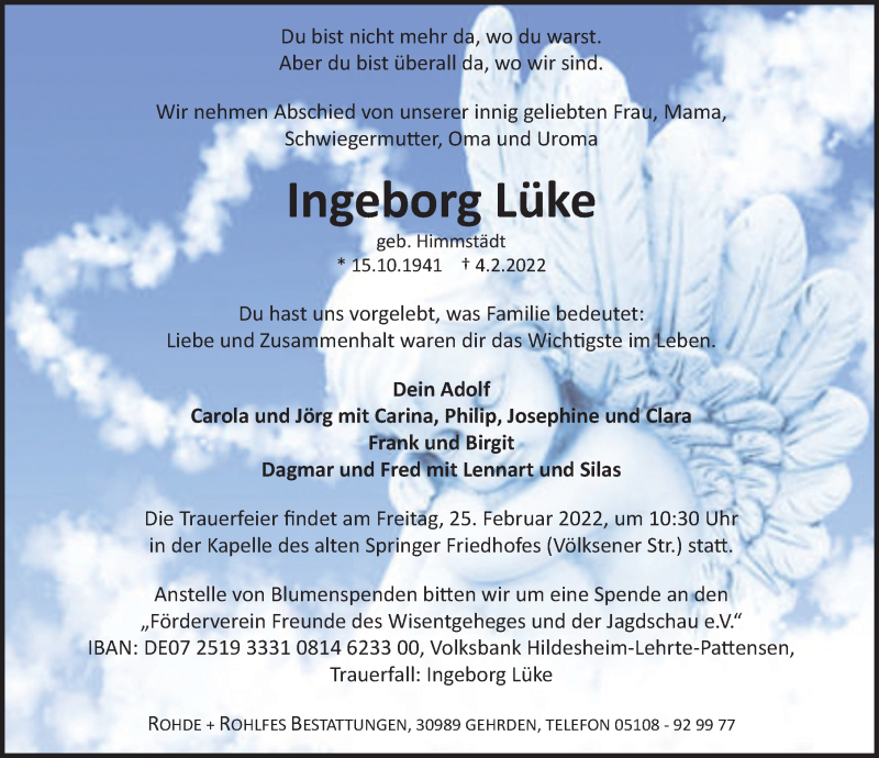 Hier finden Sie alle Traueranzeigen aus der Zeitung, die bisher für Ingeborg Lüke erschienen sind. Weitere Traueranzeigen, die in der Zeitung erscheinen, werden hier ebenfalls aufgelistet