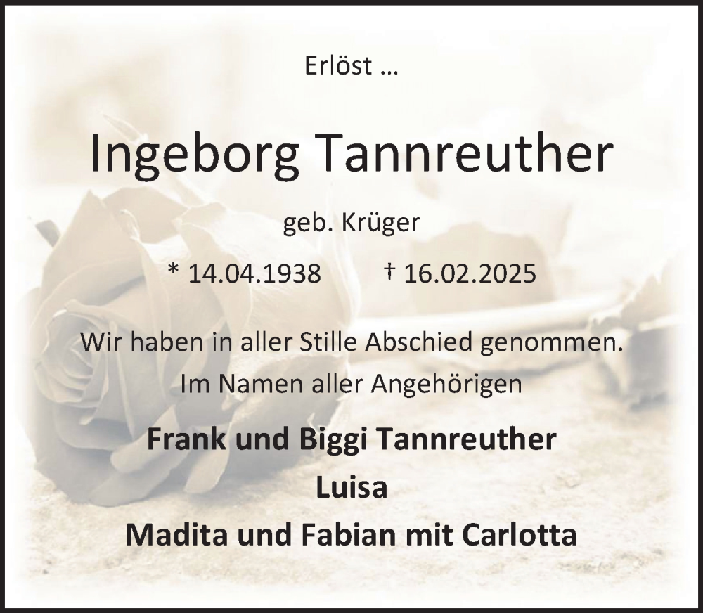 Hier finden Sie alle Traueranzeigen aus der Zeitung, die bisher für Ingeborg Tannreuther erschienen sind. Weitere Traueranzeigen, die in der Zeitung erscheinen, werden hier ebenfalls aufgelistet