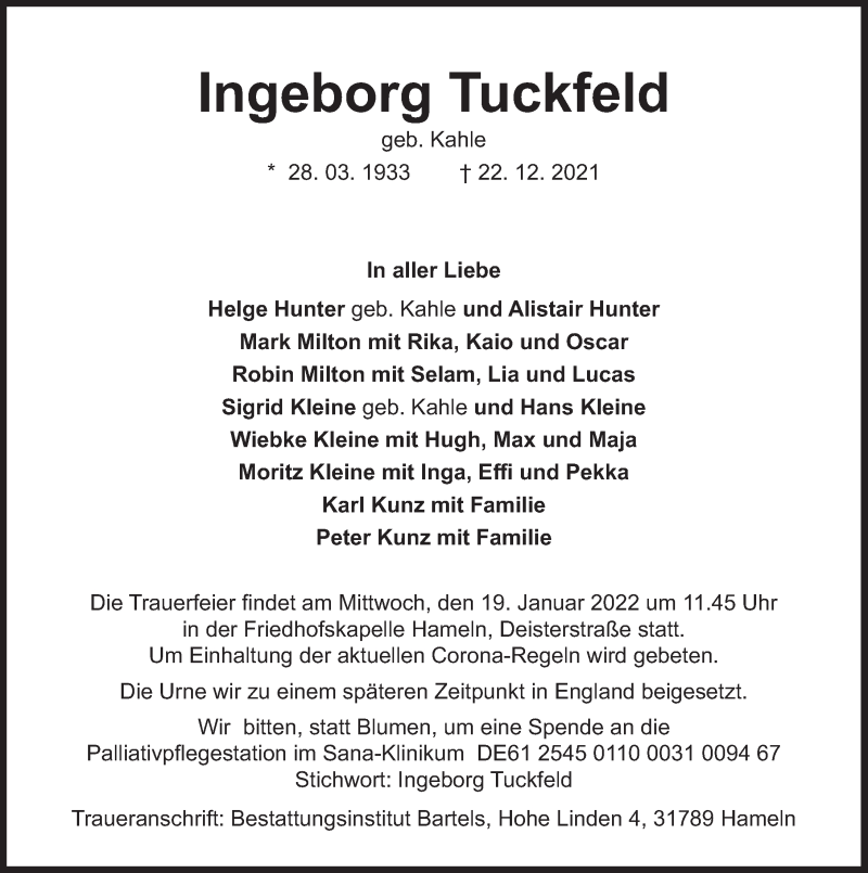Hier finden Sie alle Traueranzeigen aus der Zeitung, die bisher für Ingeborg Tuckfeld erschienen sind. Weitere Traueranzeigen, die in der Zeitung erscheinen, werden hier ebenfalls aufgelistet