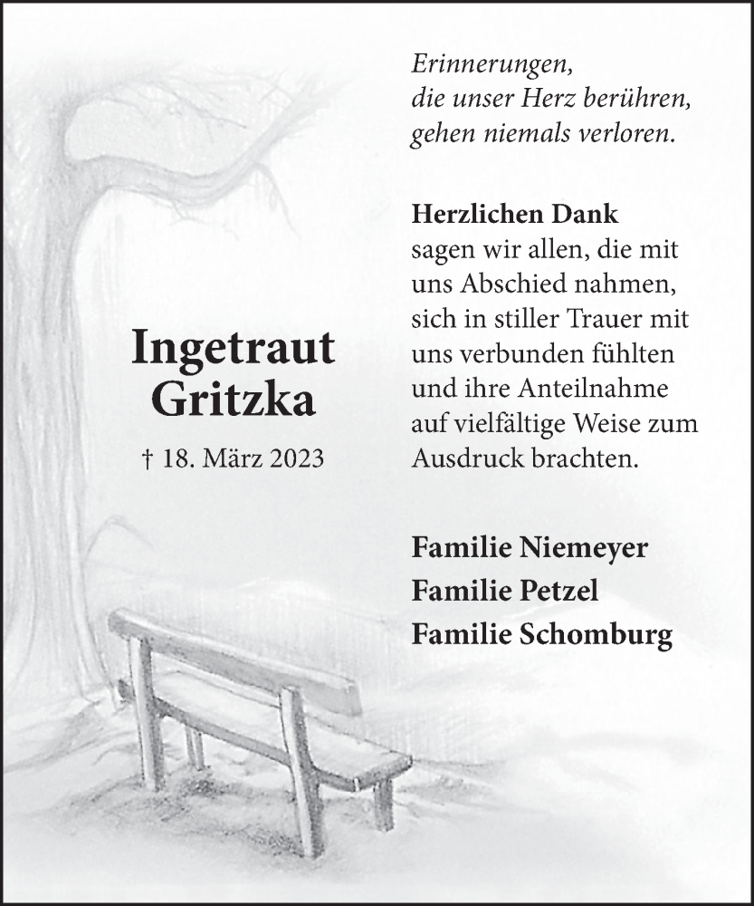 Hier finden Sie alle Traueranzeigen aus der Zeitung, die bisher für Ingetraut Gritzka erschienen sind. Weitere Traueranzeigen, die in der Zeitung erscheinen, werden hier ebenfalls aufgelistet
